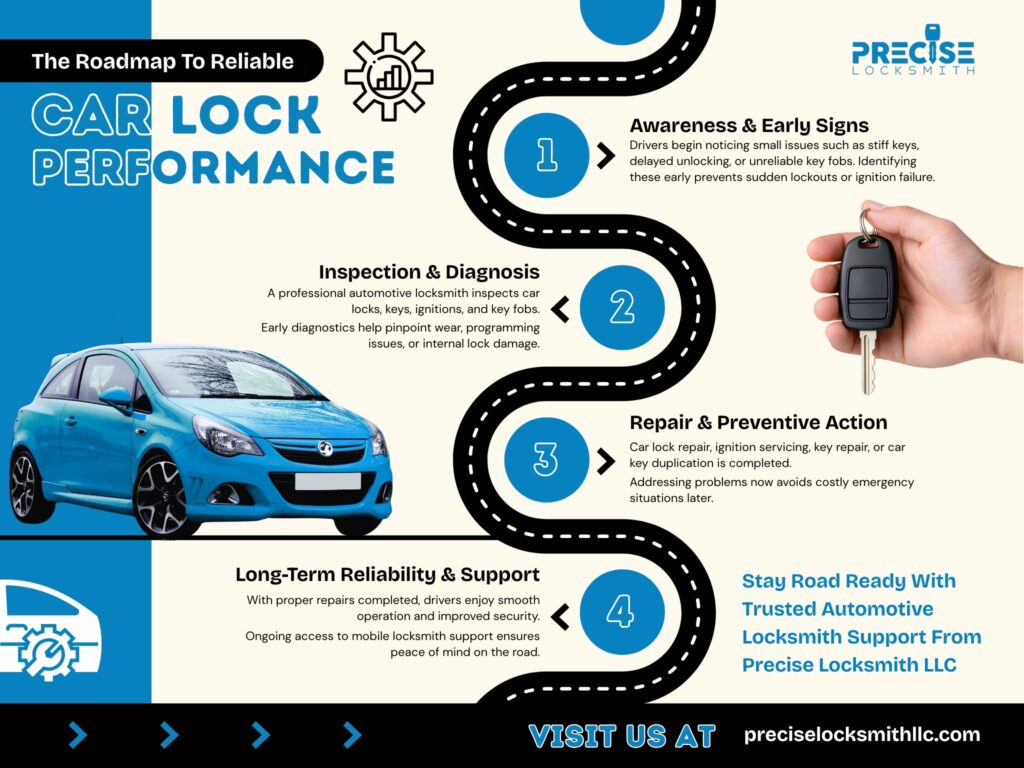 This infographic outlines a clear roadmap to reliable car lock performance, from spotting early warning signs to professional inspection, timely repairs, and long-term support. It highlights how proactive automotive locksmith services help prevent lockouts, improve security, and keep drivers road-ready with confidence.